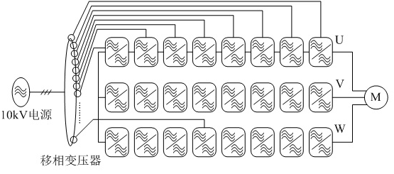 HVD3000系列高壓變頻器采取的拓?fù)浣Y(jié)構(gòu)方式為單元串聯(lián)型高壓變頻器,其為直接高-高變換電壓源型,變頻器基本原理如下圖2所示: