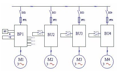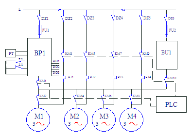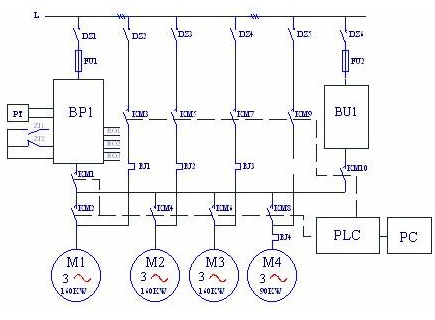 圖中:BP1—變頻器;BU2~BU4--軟起動(dòng)器,PT—壓力變送器。由圖一可見(jiàn),變頻器連接在第一臺(tái)水泵電機(jī)上,需要加泵或減泵時(shí),由變頻器RO1~RO3端口輸出信號(hào)起動(dòng)或停止其他的水泵,這時(shí)水泵的起動(dòng)采用自耦降壓起動(dòng)裝置或軟起動(dòng)器。這種方案的特點(diǎn)是水泵電機(jī)不需要在變頻和工頻之間切換;第一臺(tái)水泵永遠(yuǎn)連接在變頻器上,沒(méi)有切換過(guò)程中的失壓現(xiàn)象;由于變頻泵以外的泵都有軟起動(dòng)器,所以不需要再做備用系統(tǒng),當(dāng)變頻器故障時(shí),可用軟起動(dòng)器手動(dòng)起動(dòng)M2~M4水泵,保證供水不致中斷;每臺(tái)電機(jī)都有起動(dòng)器,初始投資較大。另一種是“循環(huán)投切”方案,系統(tǒng)圖如圖二所示