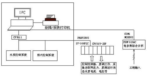 為保證系統(tǒng)的可靠性,上位機(jī)PC用于管理,用組態(tài)軟件做出若干工藝流程圖,實(shí)時(shí)顯示系統(tǒng)的運(yùn)行狀況,并統(tǒng)計(jì)歷史數(shù)據(jù),如需要可隨時(shí)打印報(bào)表;還用于故障的報(bào)警和處理。PC機(jī)為研華工業(yè)計(jì)算機(jī),PLC為西門(mén)子S-7300,便于與總控室計(jì)算機(jī)聯(lián)網(wǎng),采用帶有PROFIBUS接口的CPU315。CP5611是通信模塊,PDM-820AC電參數(shù)綜合分析儀用于檢測(cè)系統(tǒng)的用電量。控制水泵的起/停,切換,閥的啟/閉;電機(jī)電流,溫度的檢測(cè),水泵使用時(shí)間的統(tǒng)計(jì);壓力,流量,水質(zhì)參數(shù)的采集等,均由PLC完成。水壓的給定值由變頻器鍵盤(pán)設(shè)定。
