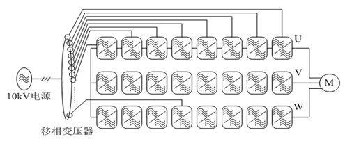 HVD3000高壓變頻器采取的拓?fù)浣Y(jié)構(gòu)方式為單元串聯(lián)型高壓變頻器,其為直接高-高變換電壓源型,變頻器基本原理如下圖2所示: