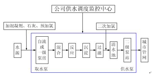 根據(jù)供水范圍及使用居民人數(shù),確定自來水廠日供水量能力。不同大小的自來水廠,其生產(chǎn)工藝流程基本相同,包括水源、取水、混合、反應(yīng)、沉淀、過濾、消毒、給水等過程。生產(chǎn)工藝流程見下圖: